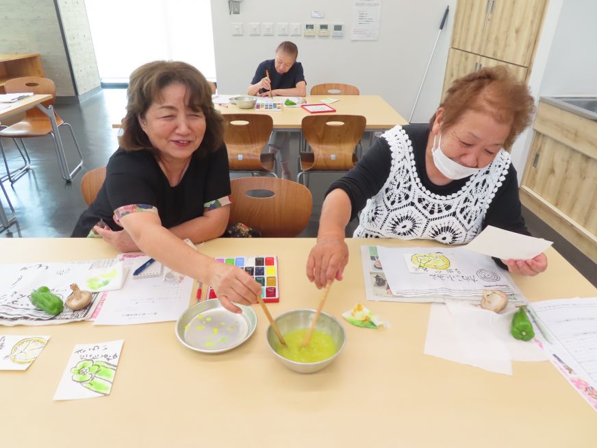 先生から絵手紙は基本さえしっかり学べば、あとは各々の個性が自然に表現されるとのお話しがありました。まずは筆の持ち方、震えても大丈夫なので、ゆっくりゆっくり筆を運ぶこと。半紙で練習後、ピーマンとしいたけの素材を見ながら1枚づつ書いてみました。皆さん集中して一生懸命に描いて、出来上がった作品を先生が講評してくださり楽しい時間があっという間に過ぎました。