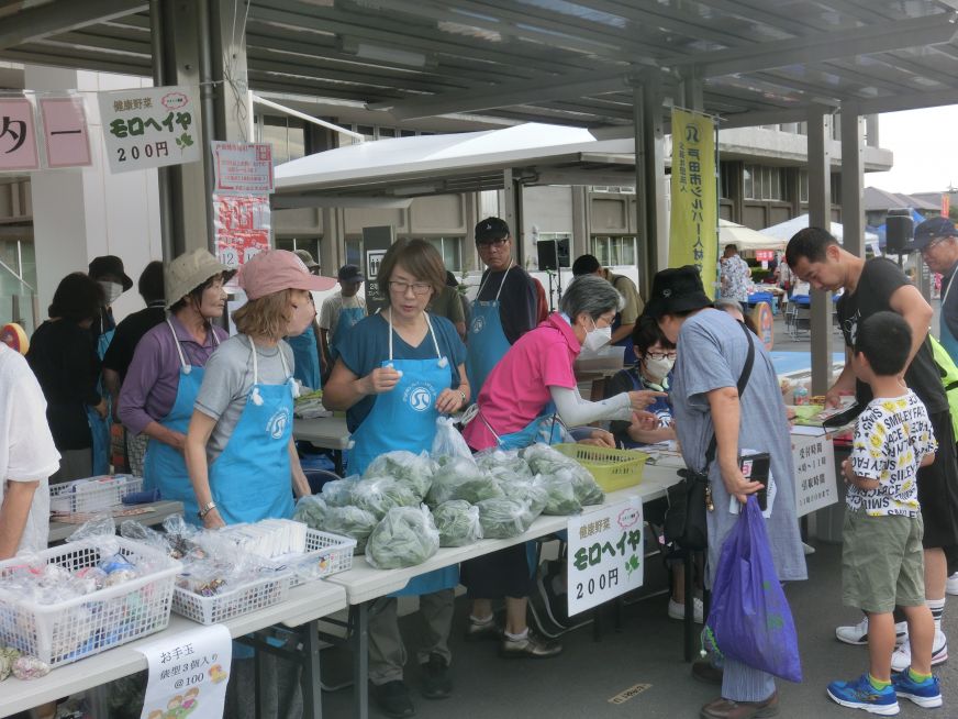 【参 加】戸田朝市当日は午前7時に4名の会員が参加、途中畑に行って追加したモロヘイヤを含めると10時には52袋すべて売り切れました。
