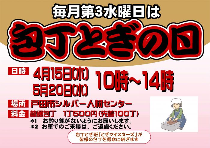 毎月第3水曜日を包丁とぎの日として、1丁500円でとぎます。(先着100丁)