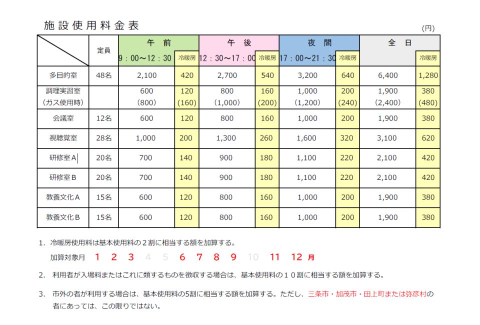 市外(三条市、田上町、弥彦村を除く)の方が利用する場合は、使用料の5割、入場料等を徴収する場合は、使用料の10割を加算されます