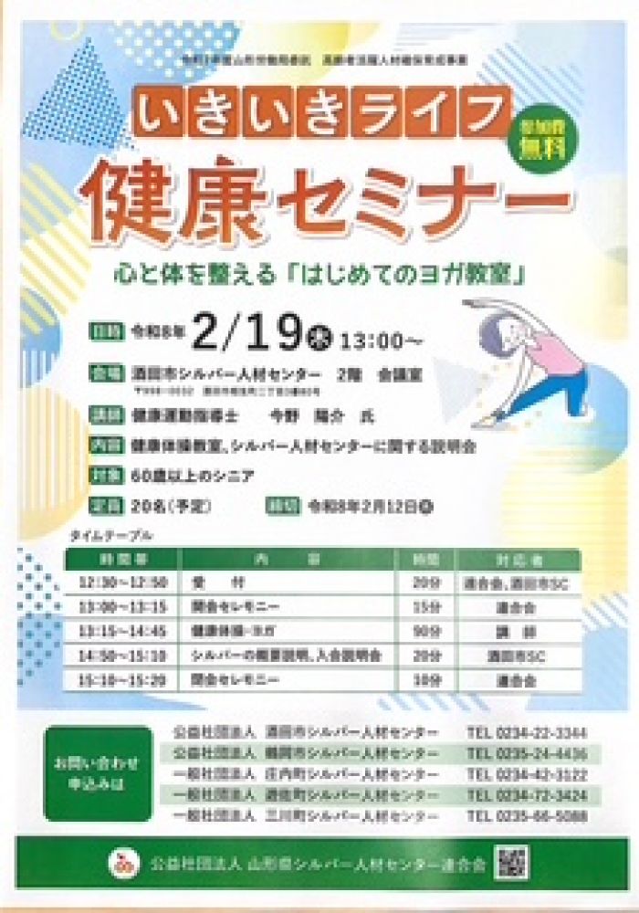 2月19日 酒田市シルバー人材センターにて「いきいきライフ健康セミナー」を開催します‼
