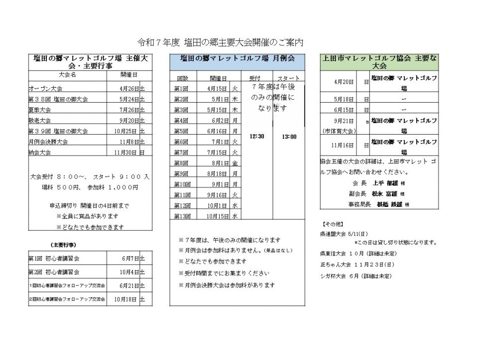 ☆塩田の郷マレットゴルフ場 令和7年度 主要大会スケジュール