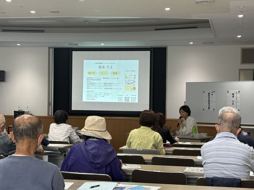 令和7年10月30日(金)ウイングまつばせ視聴覚室にて防災インストラクター松永りえ氏によるセミナーを開催しました。26名の方が受講され、日頃の生活に役立つ収納方法、元気で明るく生活するための秘訣をお話しなされ受講者の方からも大変好評でした。