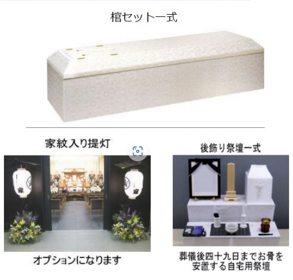 | 祭壇、 棺一式、 骨壺セット、ドライアイス、 ご遺体の搬送費用、 白木位牌、遺影写真、 喪主花2基、受付用品、 後飾り祭壇一式、納棺師の費用(白装束含む)、司会進行およびスタッフサービス料、 死亡届出・斎場関係手続き代行、 消耗品費など | |