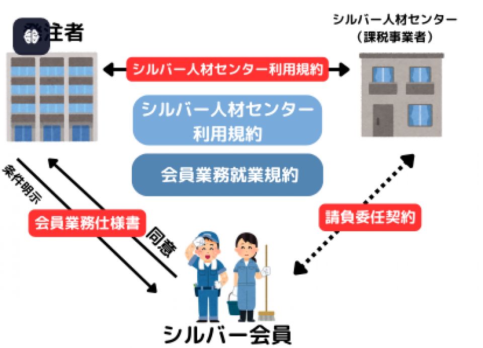 これまで、発注者とシルバー人材センターとの間で請負・委任契約を結び、センターが業務を取りまとめて会員に依頼する方式をとってきました。 しかし今後は、以下のように契約関係を明確化し、トラブル防止や適正な就業環境の整備を図ります。