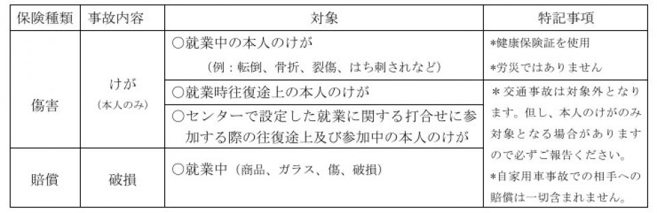 就業中、会員本人が身体に傷害を受けた場合の傷害保険と、就業中に他人の身体・財物に損害を与えた場合の賠償責任保険の2種類があります。