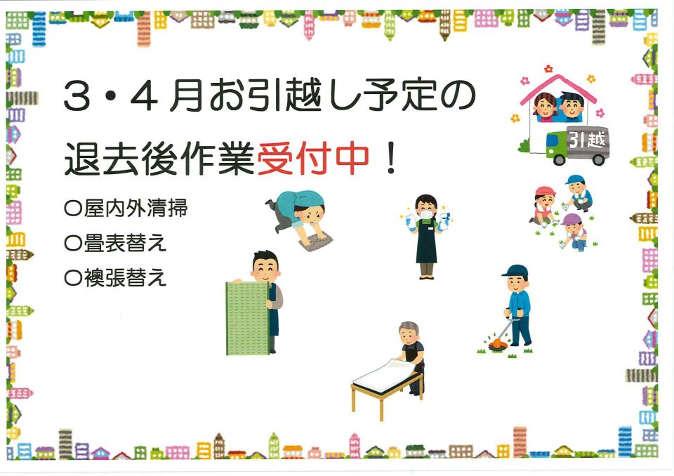 3・4月お引越しのご予定で、退去後の「屋内清掃・畳張替え・襖張替え」をご依頼希望の方は、退去直前でのご依頼は、受注状況によりお受けできないことがありますので、お早めに受付をお願いいたします。