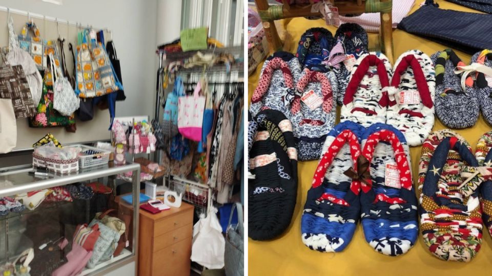 古布からリメイクした衣類、バック、帽子、草履などの作品を展示販売します。