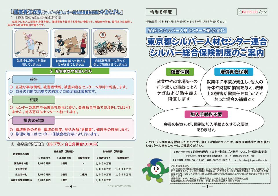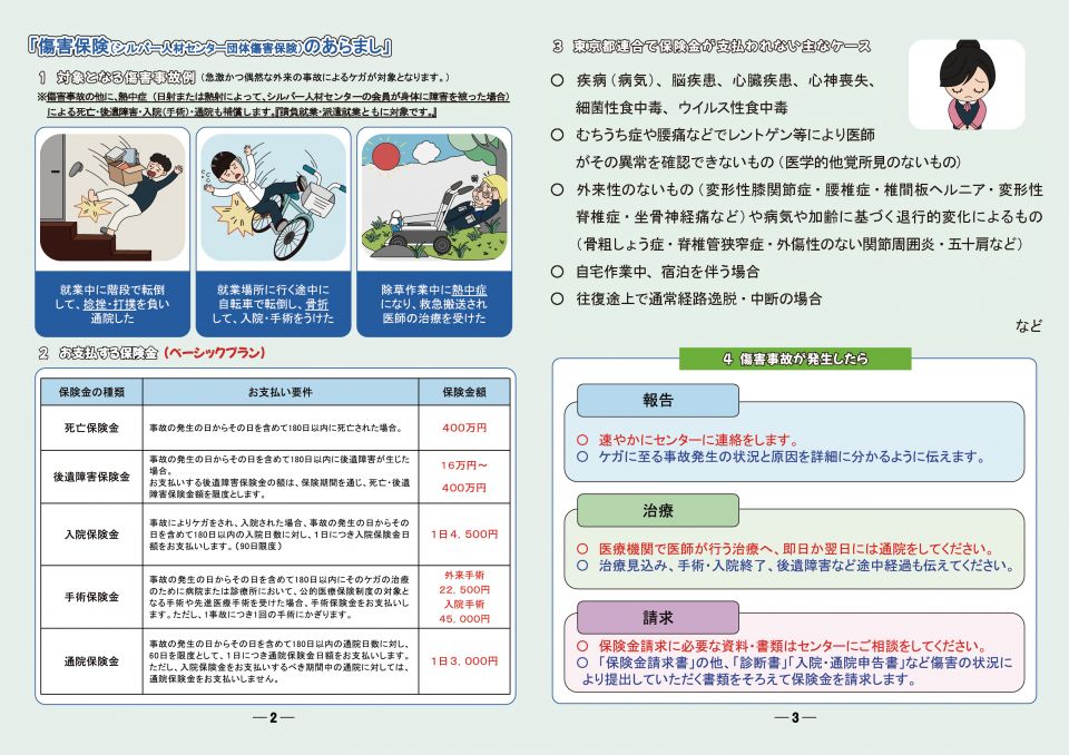 この保険には、会員本人が就業中にケガをした場合の「傷害保険」と会員が就業中に他人の身体、財物に損害を与えた場合の「賠償責任保険」の2種類があります。尚、2種類の保険ともシルバー人材センターが契約した保険会社の約款の定めにより補償されます。
