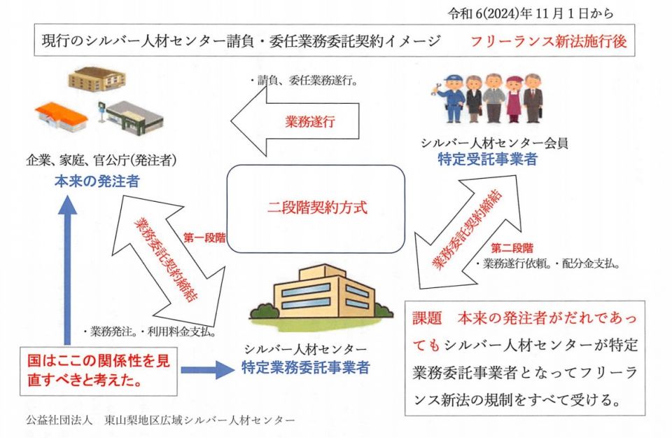 フリーランス新法は令和6年11月1日に施行されるが、国はシルバー人材センターの現在の2段階契約方法、第1段階(本来の発注者→センター)、第2段階(センター→会員)においては本来の発注者が実質的に業務内容などを決めるので、本来の発注者がフリーランス新法を順守する仕組みとすることがより判りやすく、会員の保護という観点からもより効果的であるとの考えなどから、現在の2段階契約方法の見直しに向けて取り組みを行っている