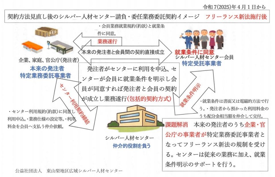 厚生労働省は令和5年11月13日付職発1113第1号で、各都道府県知事あてに「特定受宅事業者に係る取引の適正化等に関する法律の施行を見据えたシルバー人材センターにおける契約方法の見直しへの協力依頼」とした文書を発出し、「センターはこれまでと同様のサービスを提供しつつ、発注者がセンターの会員と直接業務委託契約を締結し、こうした契約に基づいて会員が業務に従事することとなるよう、フリーランス法施行を見据えて契約方法を見直す」ことを主旨とした見直し後の契約書類(ひな形)などの文書等を送付し、都道府県関係部局と管内の市区町村にも周知を依頼した