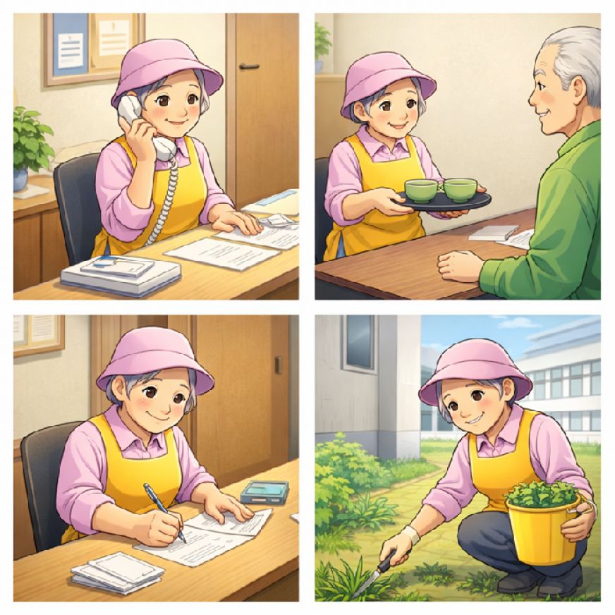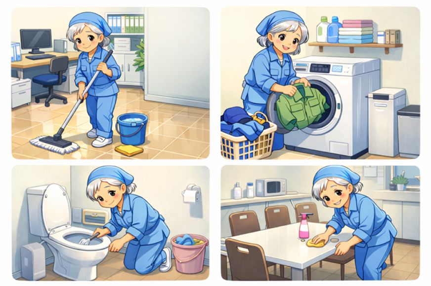 作業内容:トイレ、休憩室、喫煙室・作業服洗濯等作業