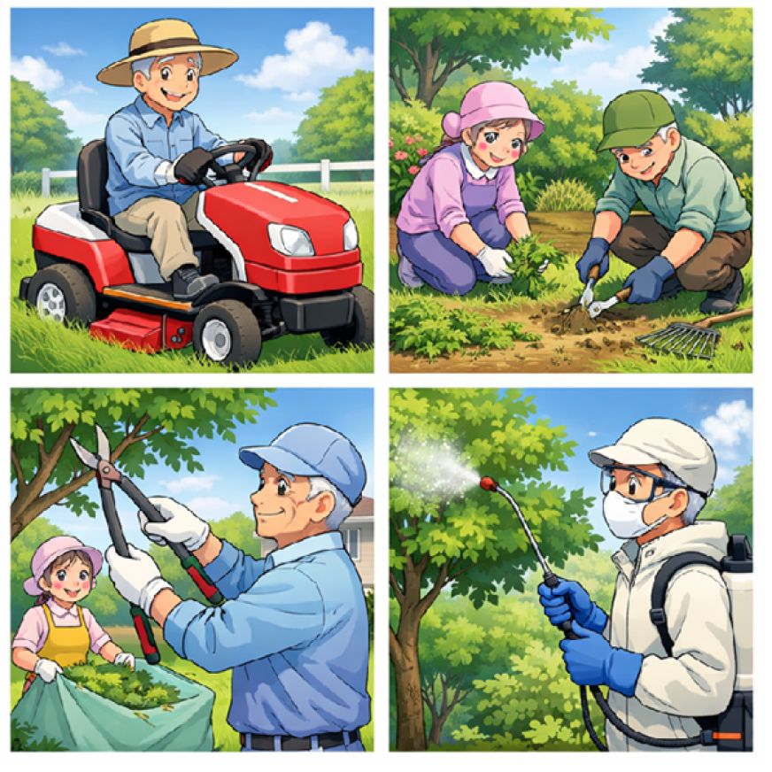 作業内容 : 草刈(乗用芝刈り機含む)、除草、剪定、植木消毒