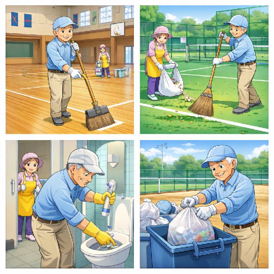 作業内容 : 清掃、トイレ清掃、ゴミ処理