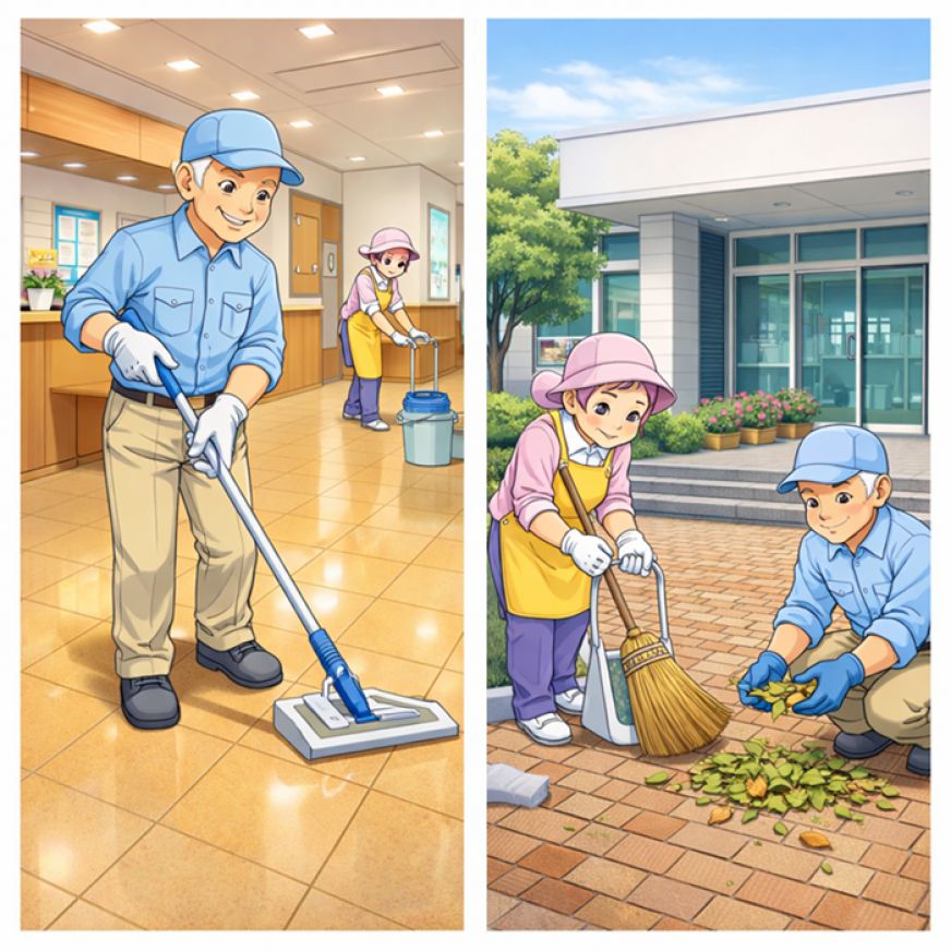 作業内容:施設内の居室・トイレ・通路、玄関等(水拭きモップでの拭き掃除、掃き掃除等)