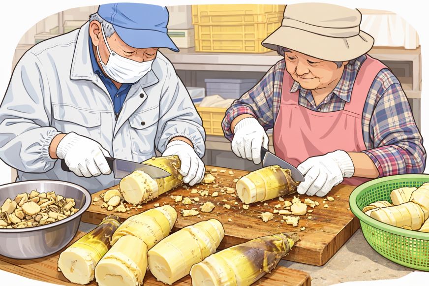 作業内容:ボイルした竹の子の節と根をまな板の上で切り落とす作業