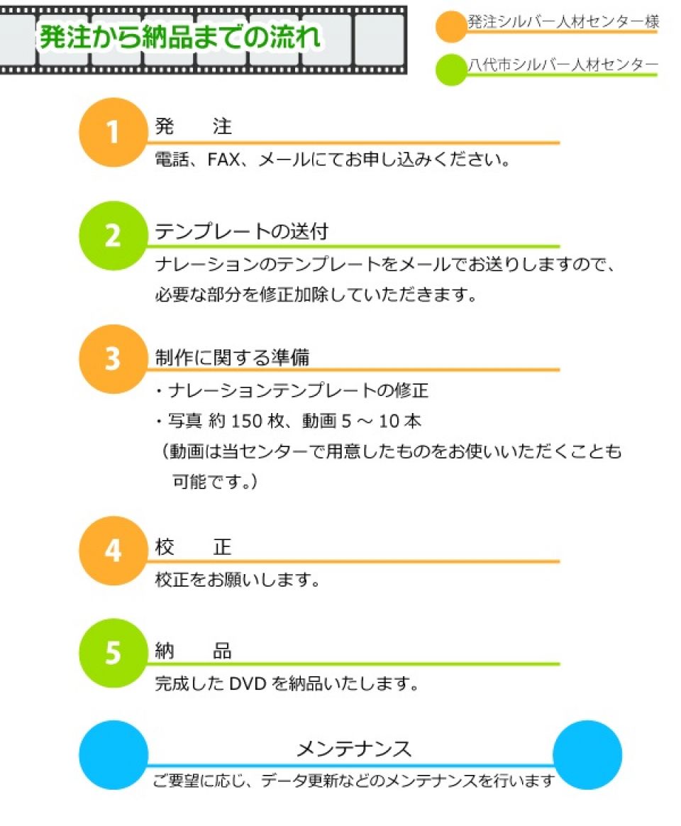 本編の構成とナレーションのテンプレートをお送りします。必要な部分を訂正して、写真や動画のデータをご返送いただくだけです。事業内容や実績が変わったときはDVDの内容の変更もできます。