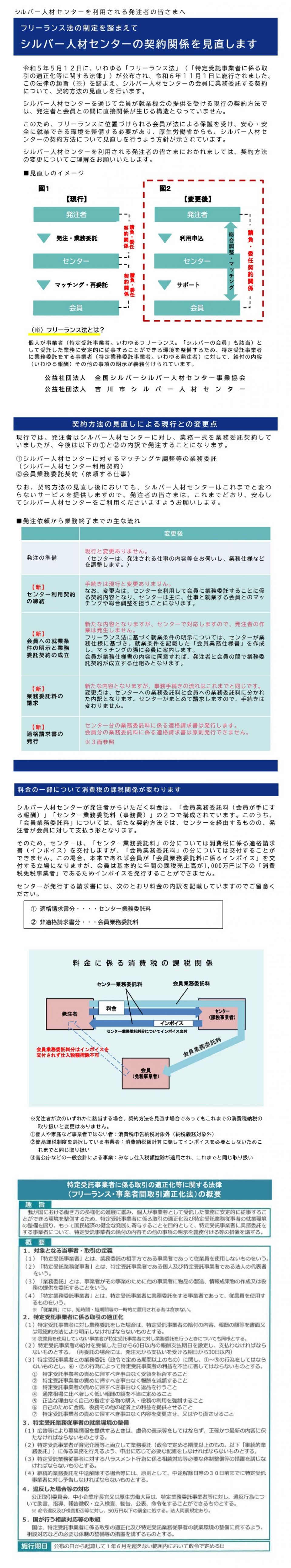 請負・委任で働くシルバー人材センター会員は「フリーランス」に該当しますので、本法律の趣旨を踏まえて令和7年度より契約方法の見直を予定しております。